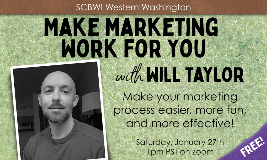 The Saturday, January 27, class takes place at 1pm PST on Zoom. Register for free at https://www.scbwi.org/events/make-marketing-work-for-you-with-will-taylor.