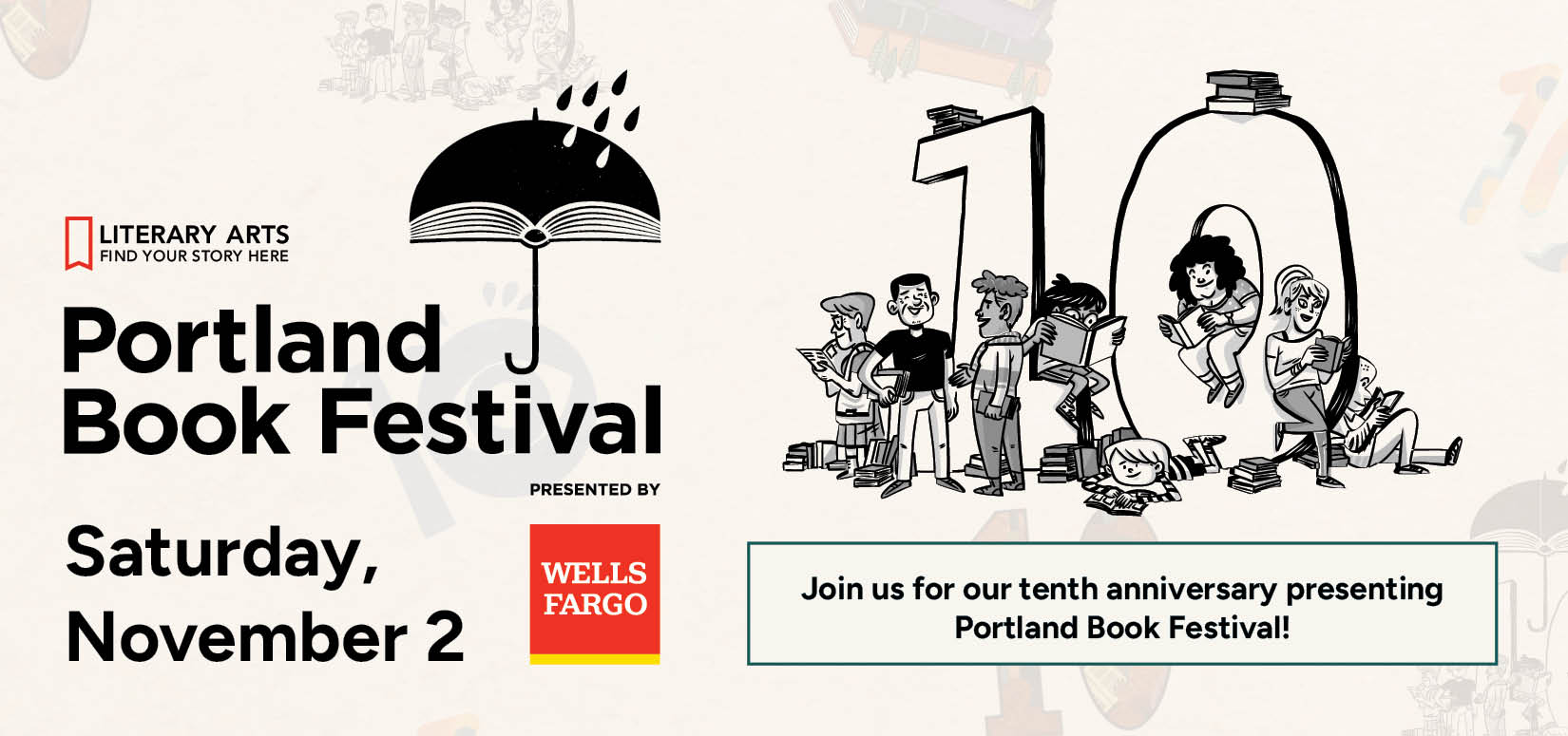 Literary Arts is celebrating a decade of producing a successful book festival in Portland, OR. This year’s Portland Book Festival, presented by Wells Fargo, returns Saturday, November 2 to ten stages at six partner venues in downtown Portland’s south Park Blocks. More than 100 authors and interviewers, drop-in writing workshops, pop-up readings, a book fair, and local food trucks return for this 10th annual celebration of books and stories.